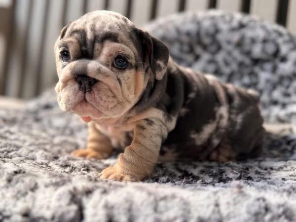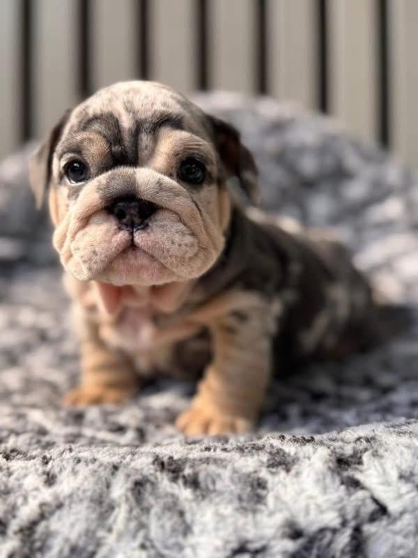 Meet Maribelle, a stunning lilac merle English Bulldog puppy with a face thatâs impossible to resist. Her soft, marbled coat blends shades of cream, lilac, and silver, giving her a truly unique and elegant look. With her round cheeks, expressive eyes, and signature bulldog wrinkles, Maribelle is the picture of charm and sweetness.