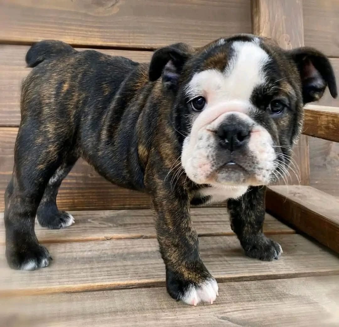 Meet Max, a handsome black tri-color English Bulldog puppy with a striking and classic brindle pattern. His short, glossy coat features bold black stripes over a rich fawn base, accented by clean white markings on his chest, face blaze, and paws — the perfect traditional “black tri” look. With his deep bulldog wrinkles, strong bone structure, and big, round dark eyes, Max has that irresistible serious‑yet‑sweet expression that melts hearts instantly.