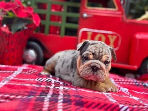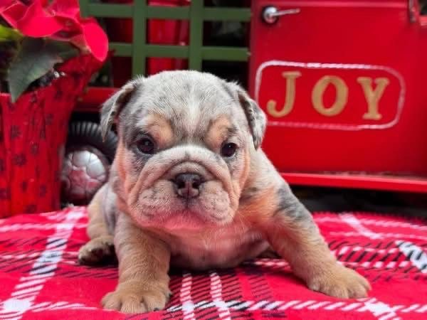Meet Remi, a gorgeous lilac merle English Bulldog puppy with a one‑of‑a‑kind coat that’s sure to turn heads. His plush fur features a soft lilac base with beautiful marbled merle markings and warm tan points on his legs and cheeks. With his deep wrinkles, compact build, and that signature bulldog pout, Remi is the perfect mix of adorable and distinguished.